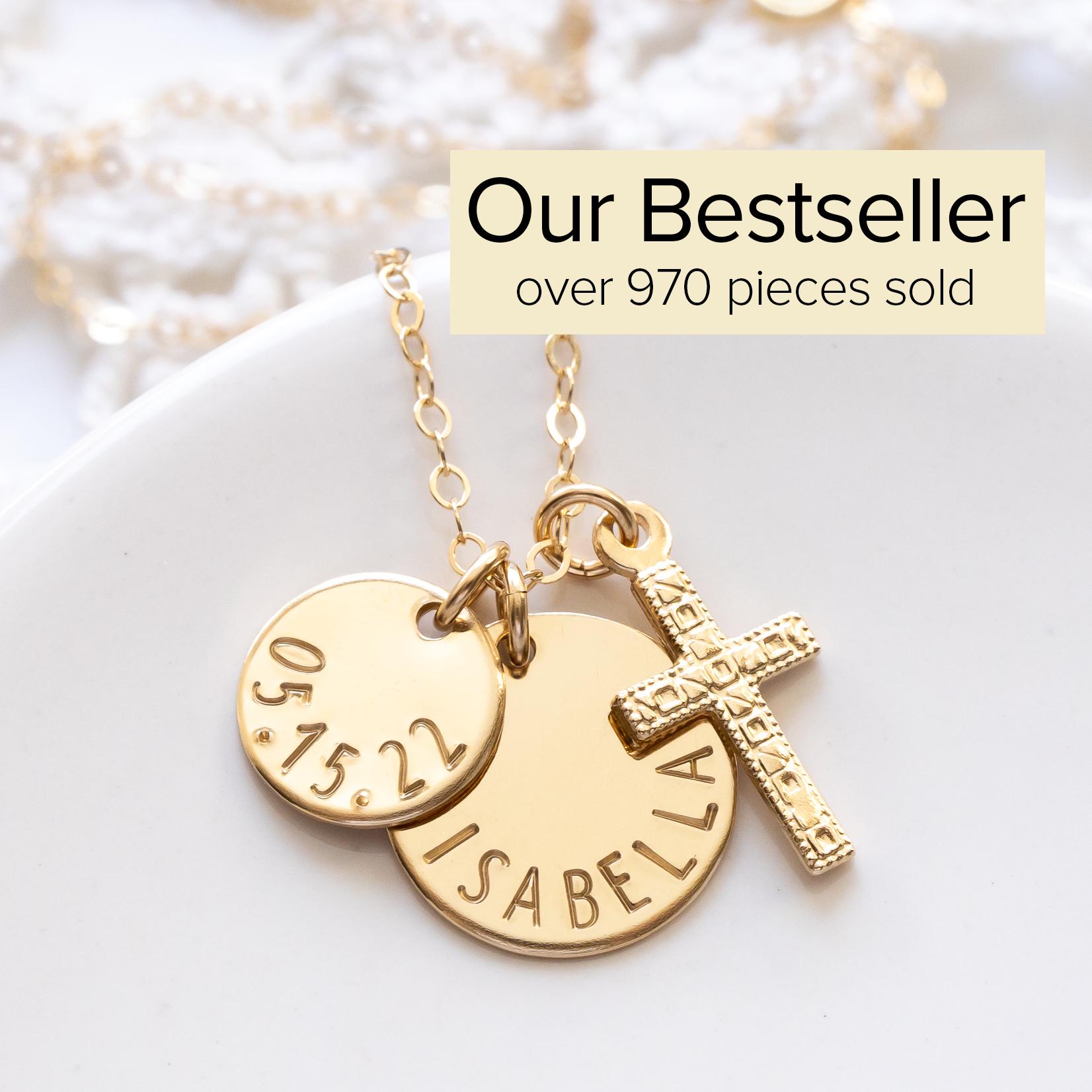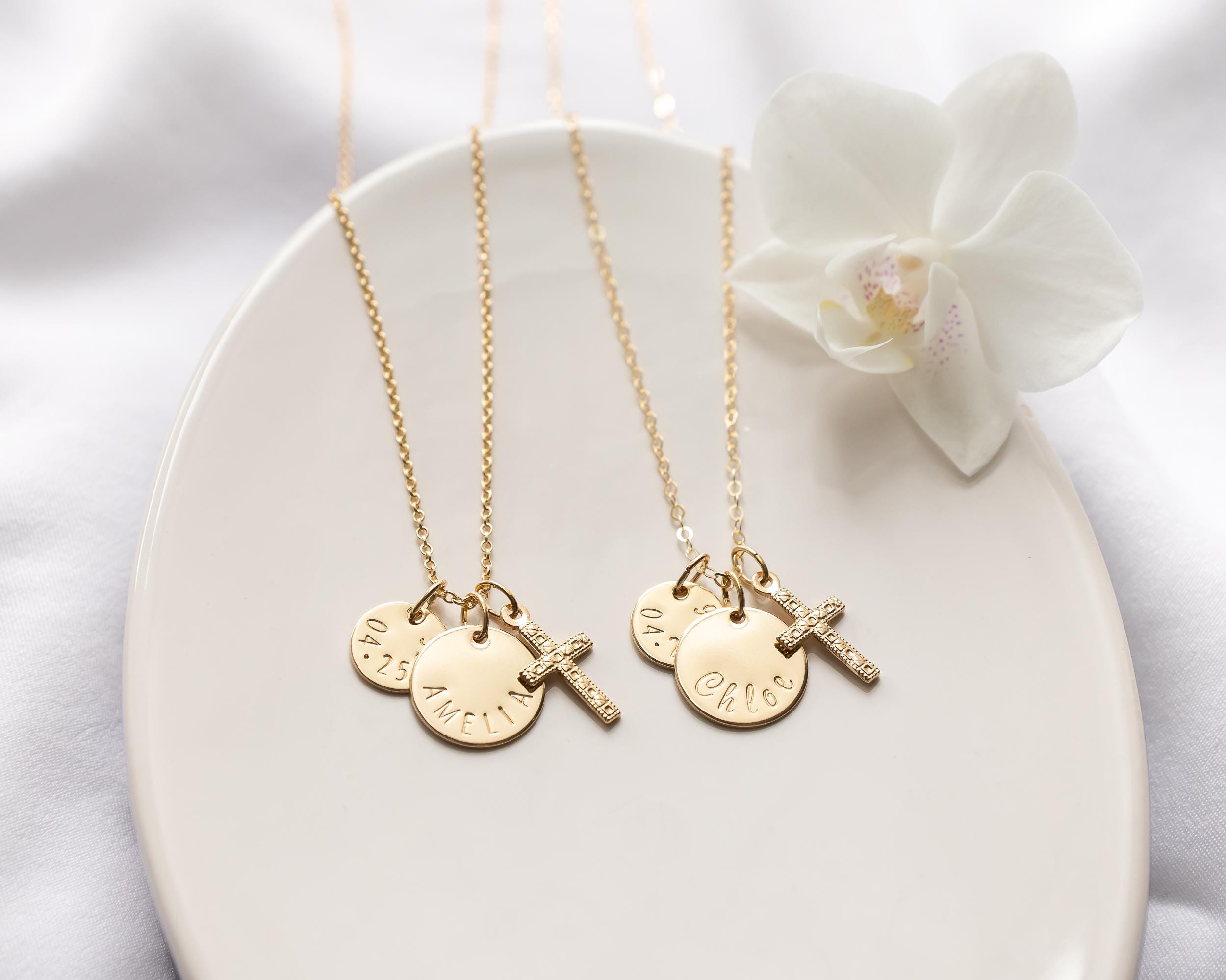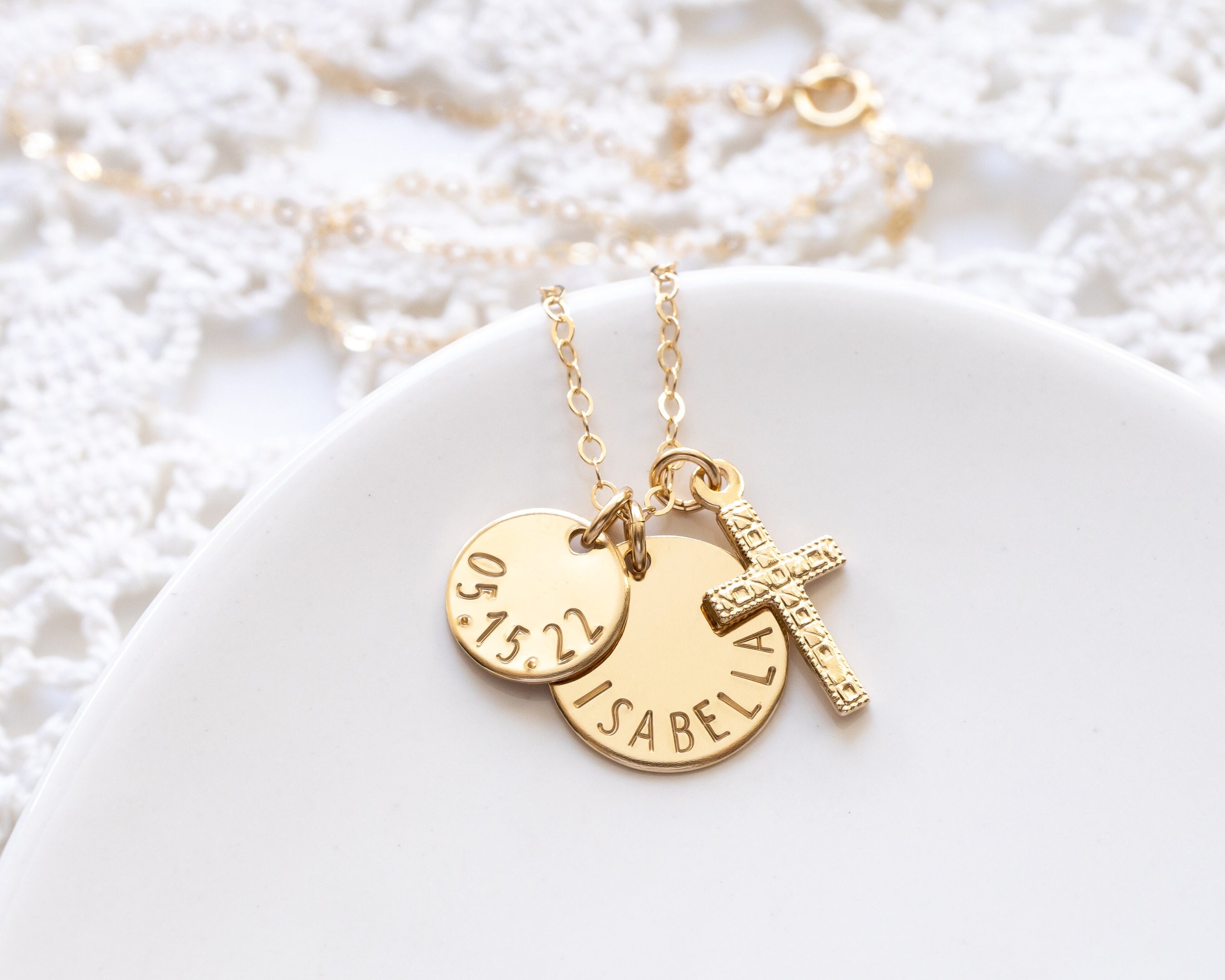Personalized Cross Necklace, Gold Filled, Hand Stamped Name & Date Charms