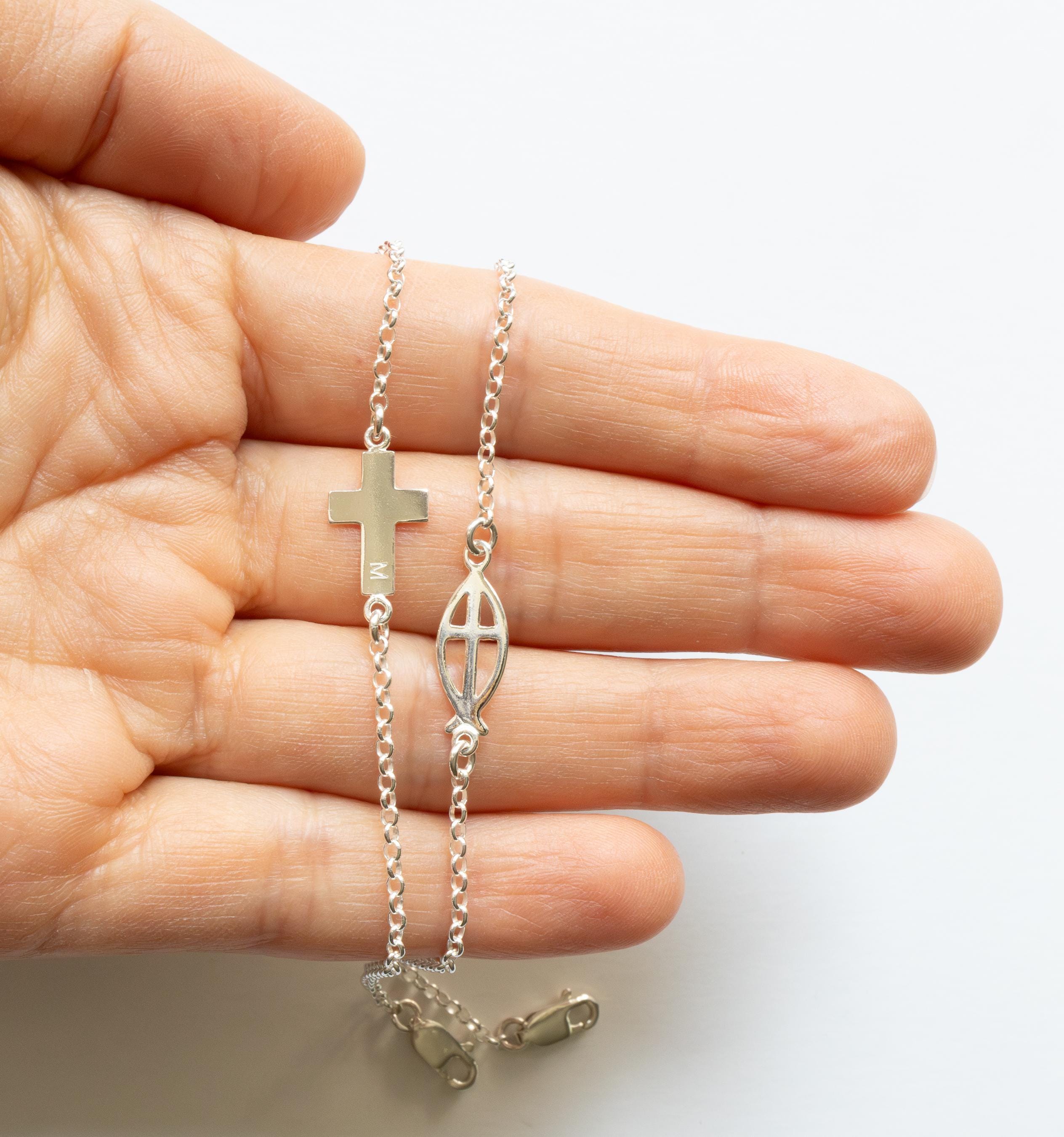 Sterling Silver Cross Bracelet Personalized with Initial, Dainty and Minimalist