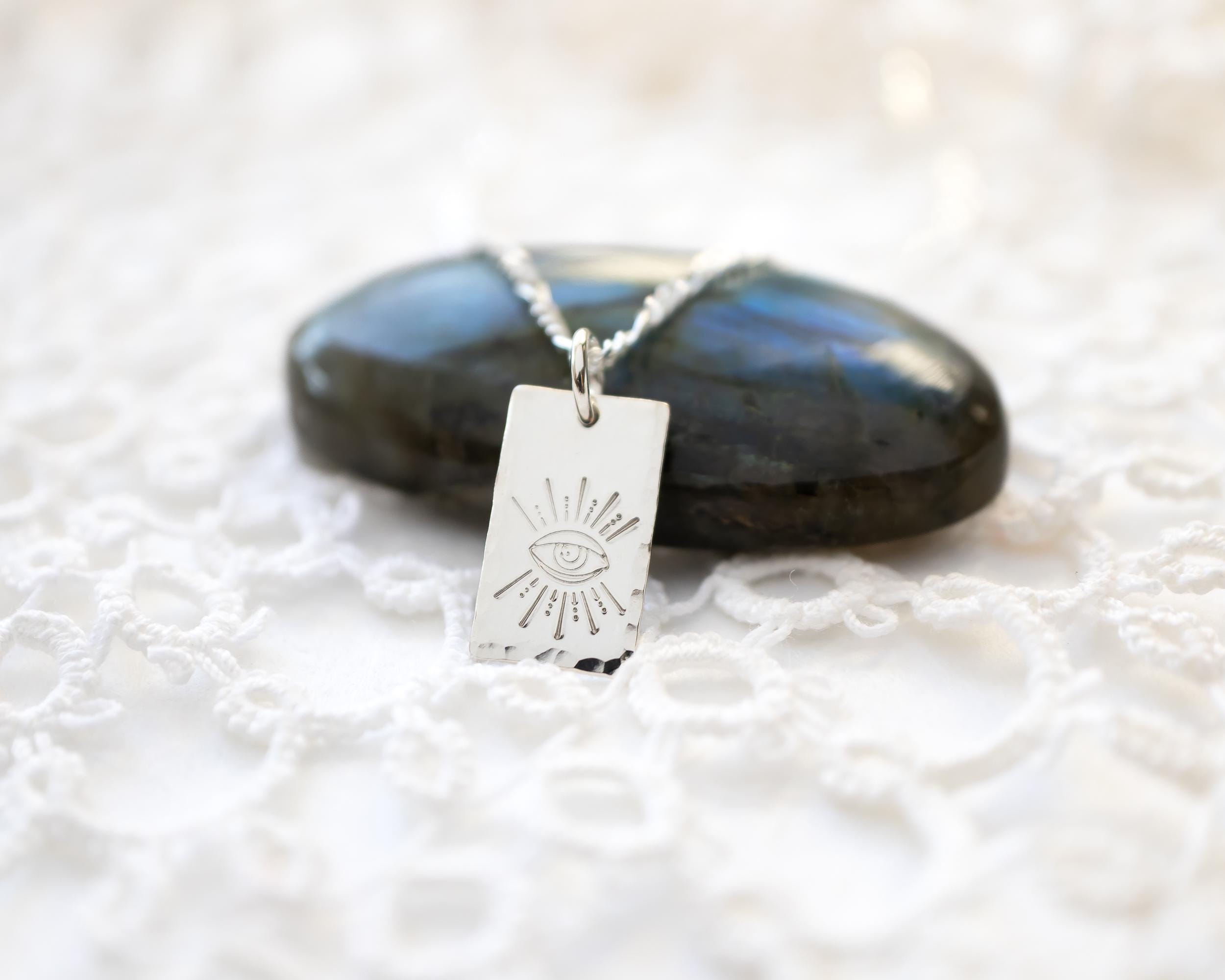 Hand-stamped on a sleek rectangle tag, the image of the eye surrounded by rays seems to vibrate with protective energy.
