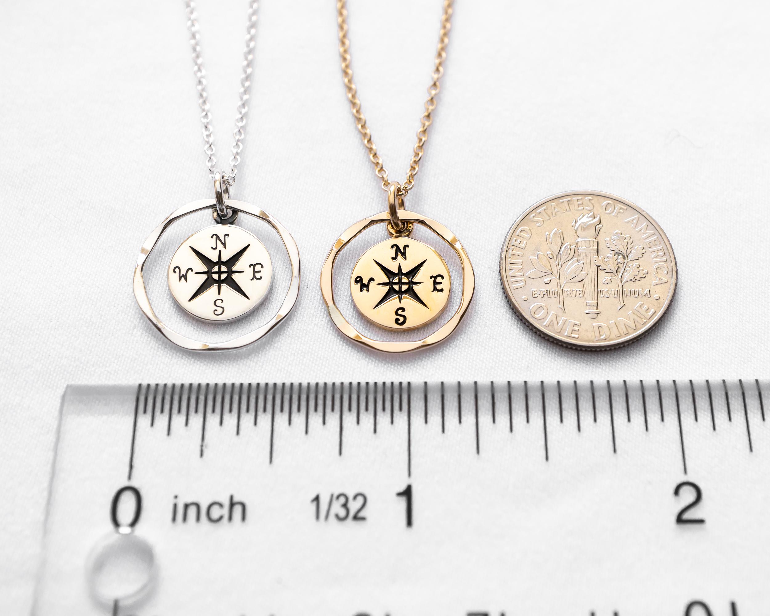 Beautifully detailed compass charm is framed in a lightly hammered circle, floating freely around the charm.