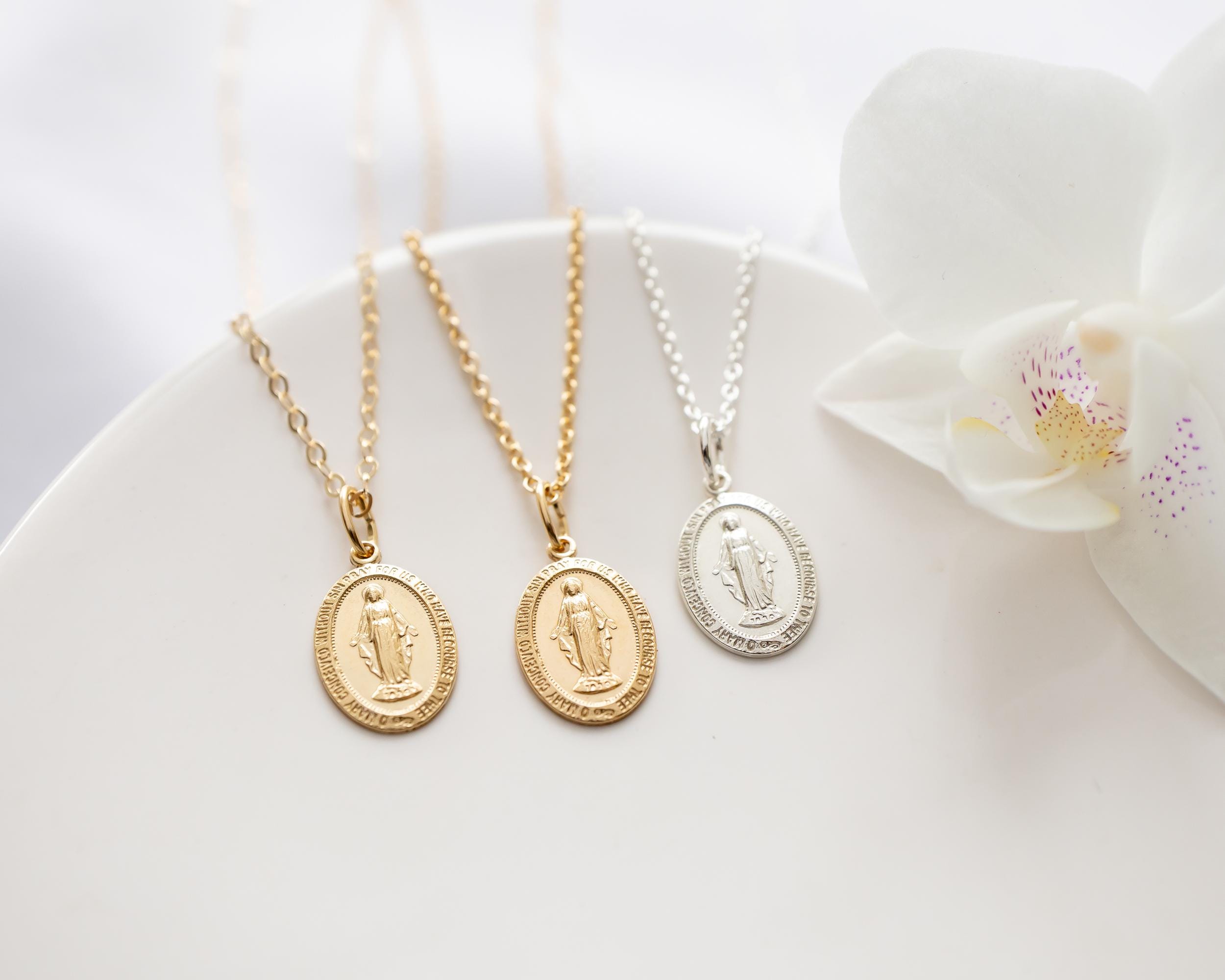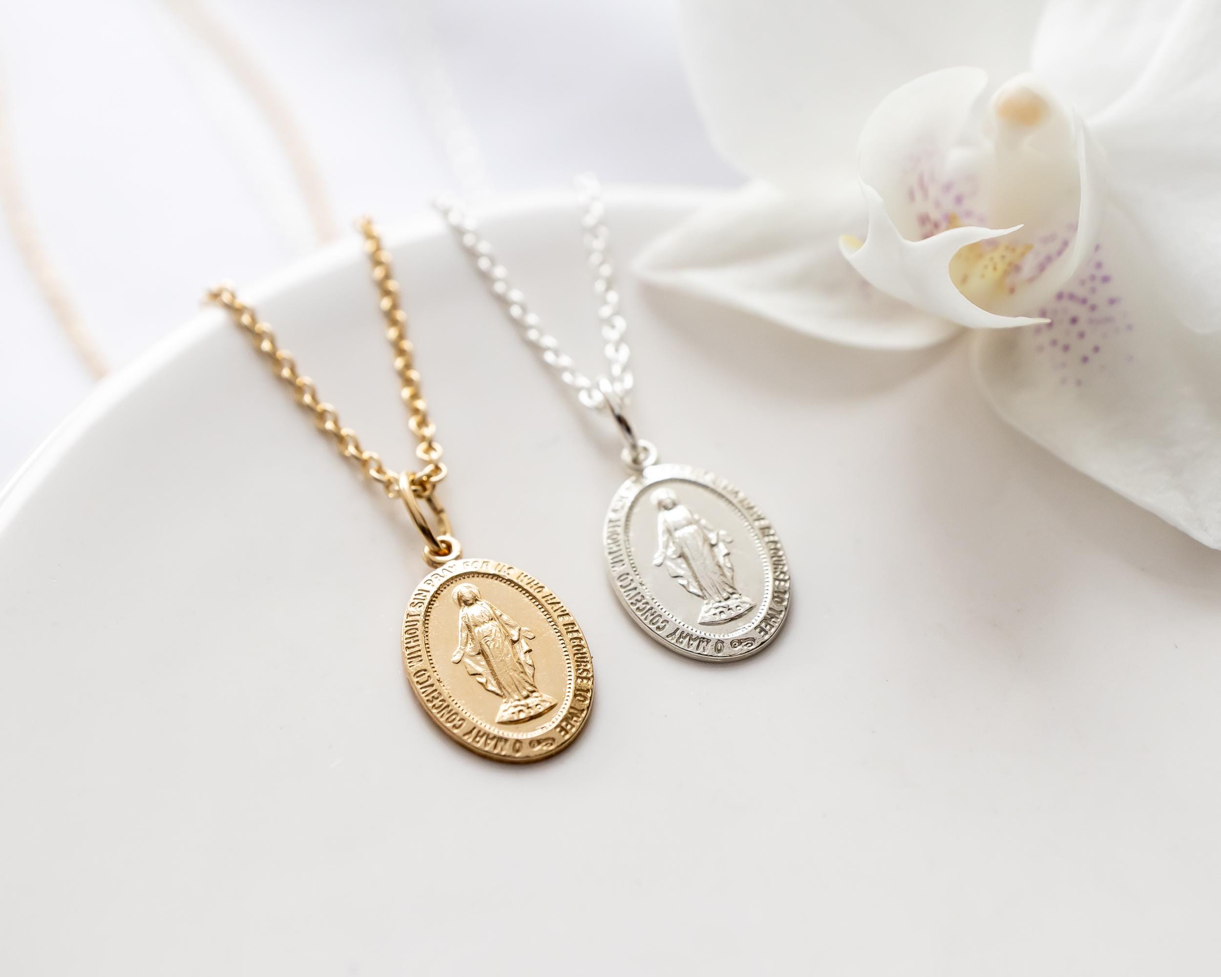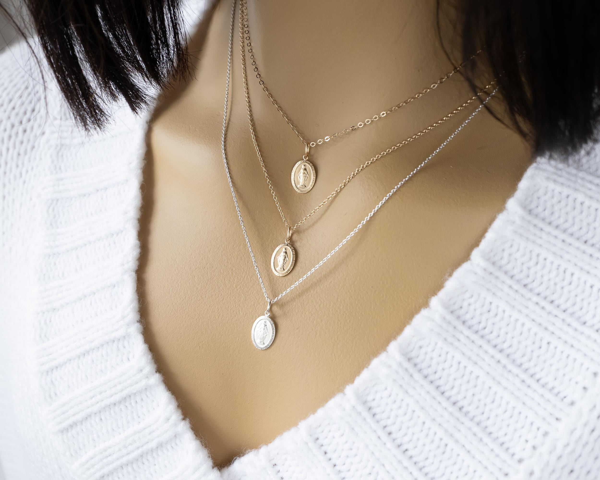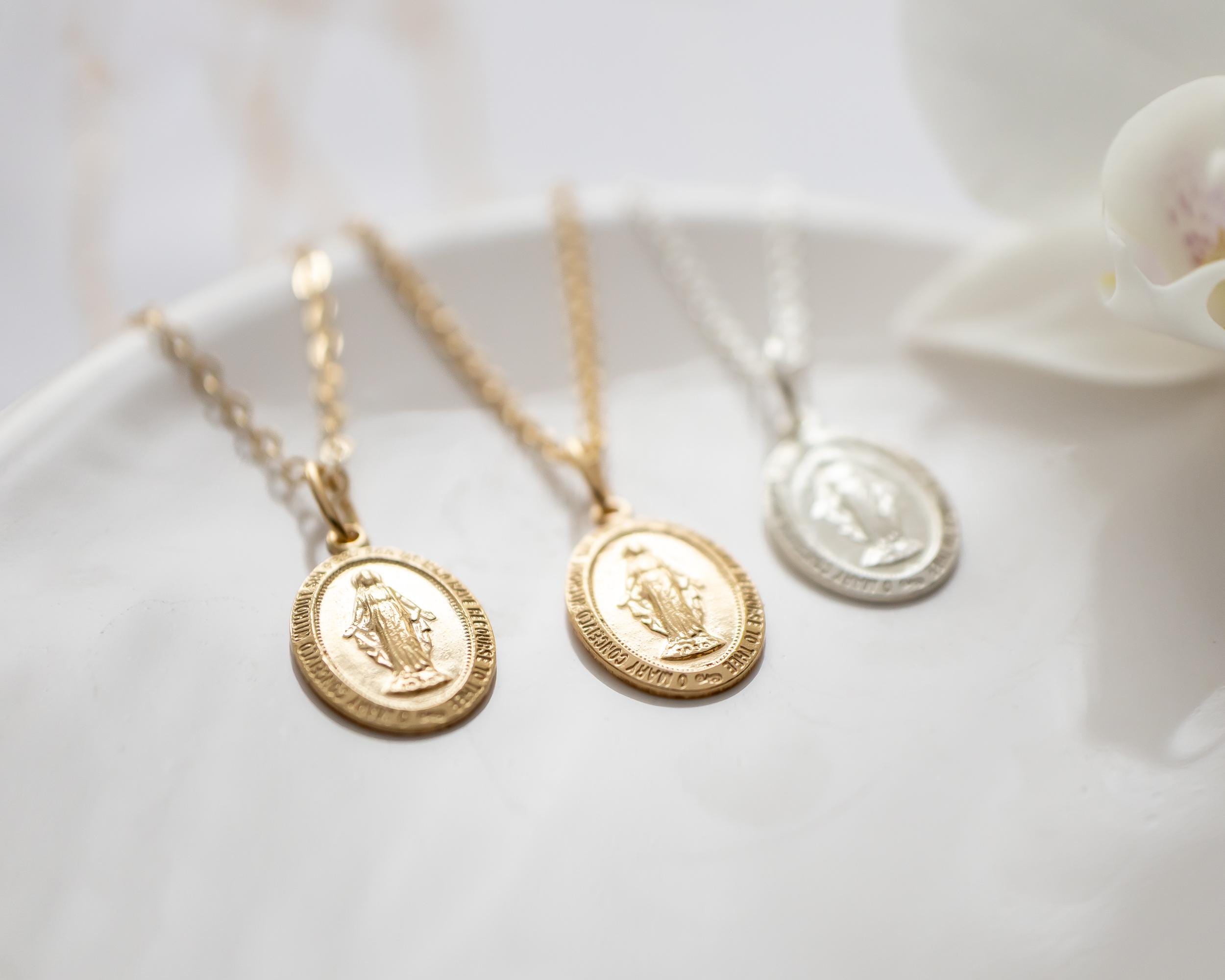 Intricate and iconic Miraculous Medal necklace for girls and women.