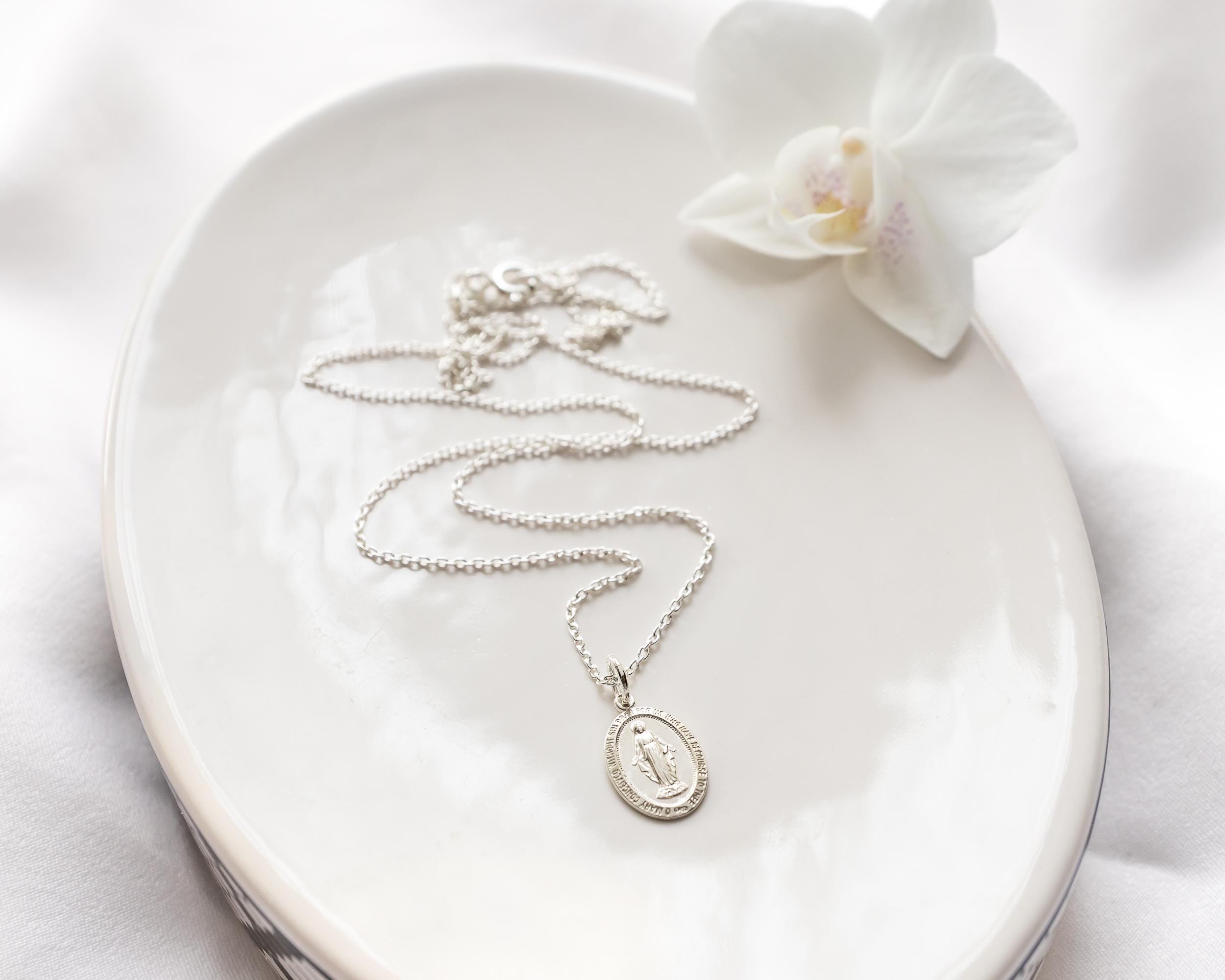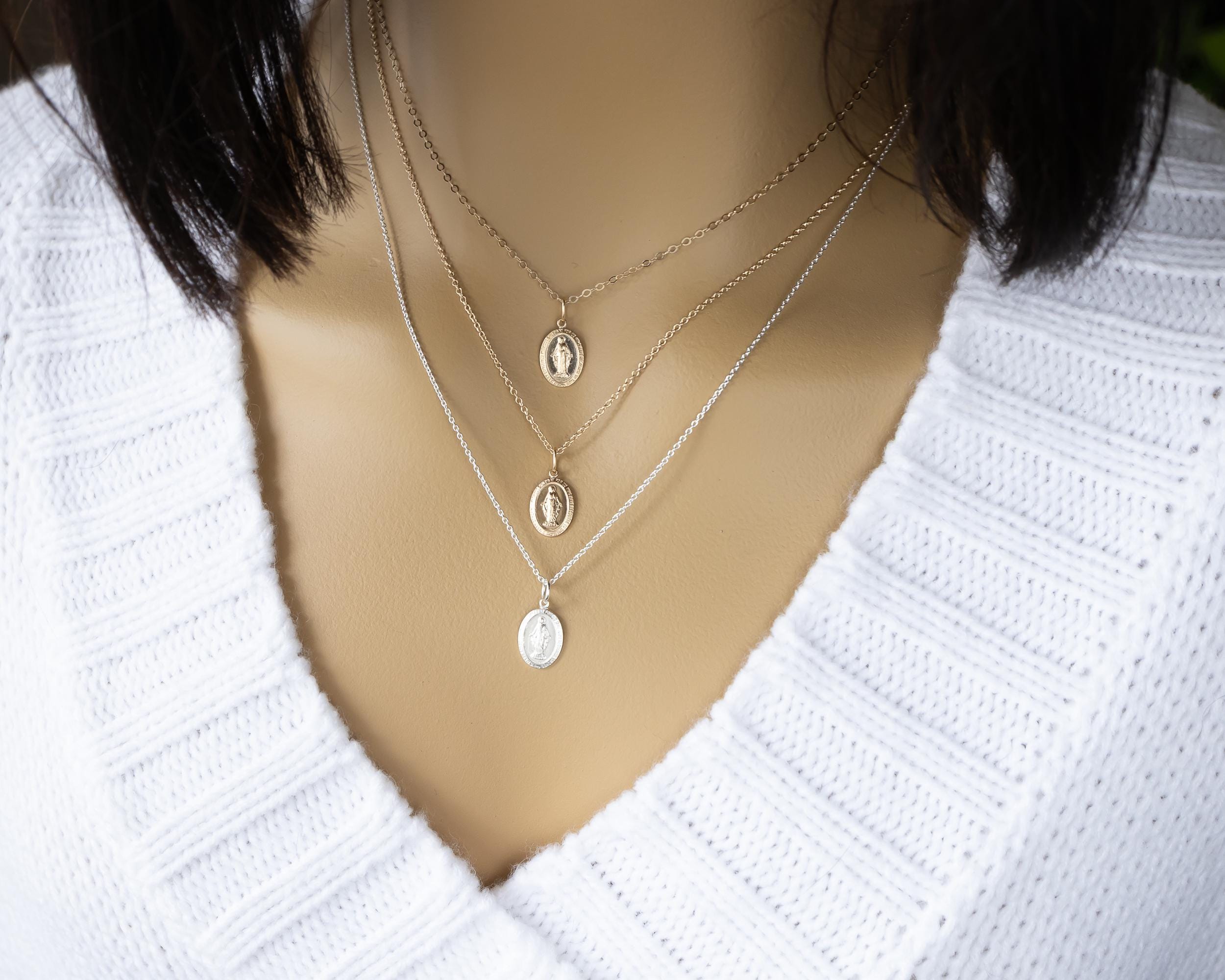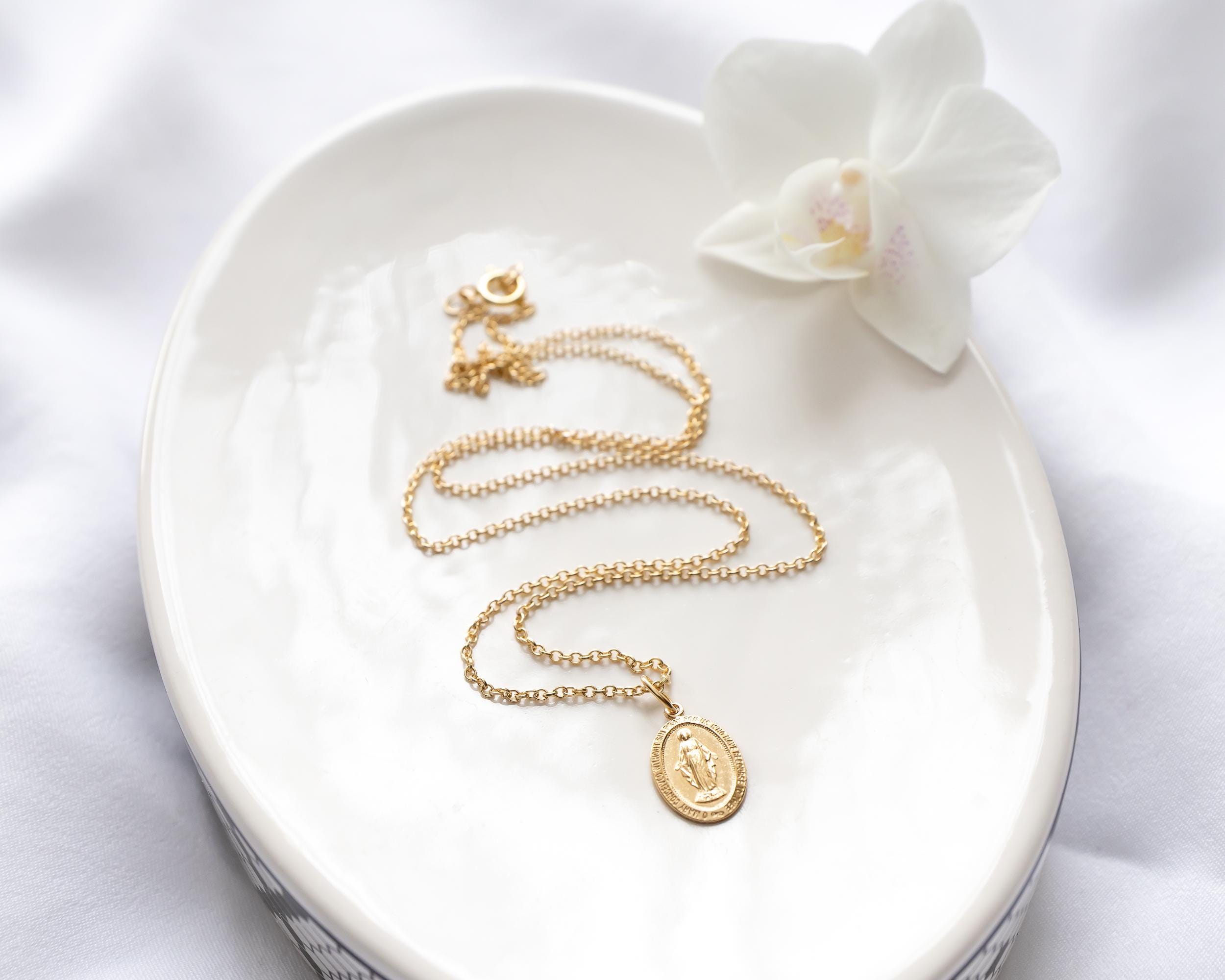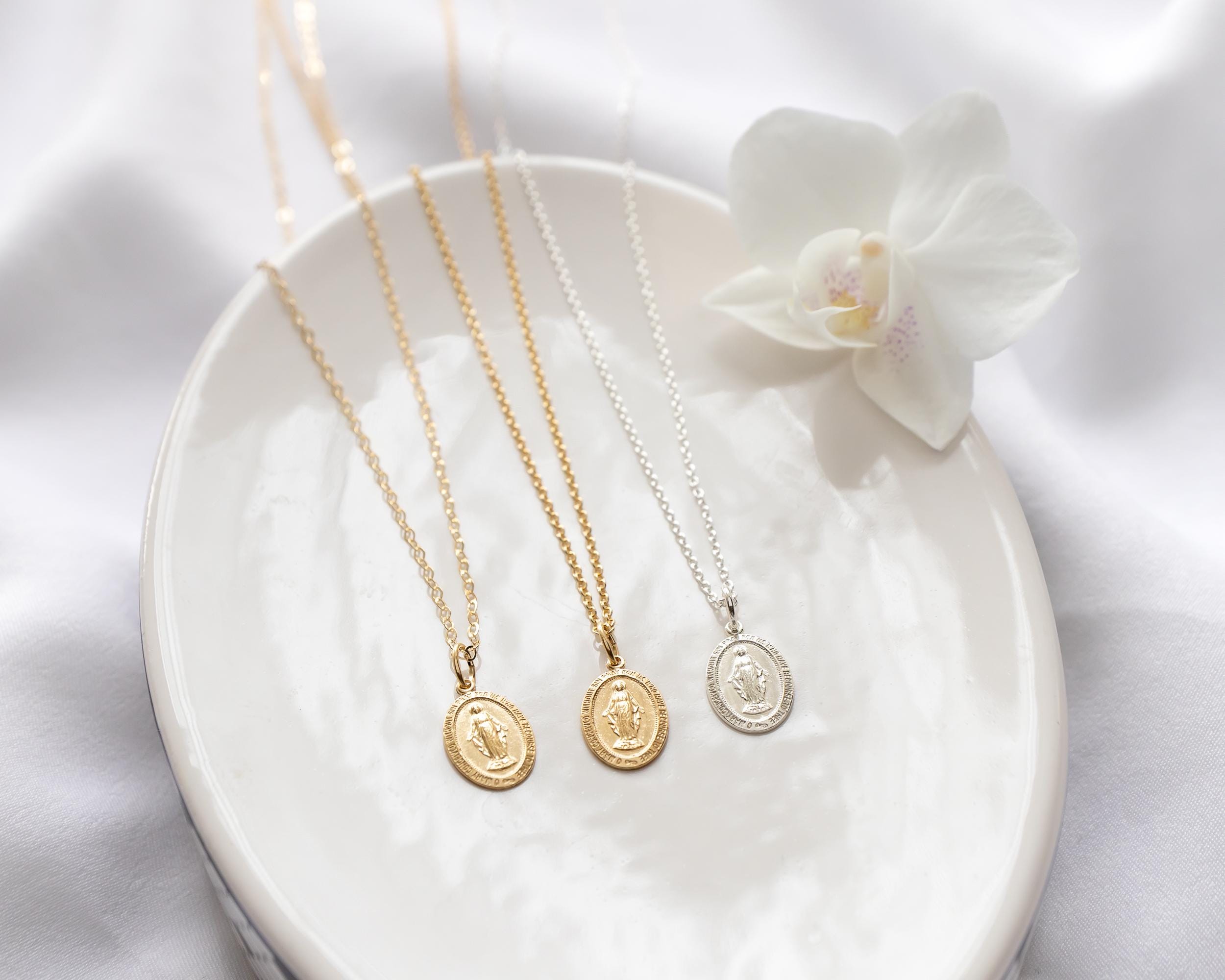 Intricate and iconic Miraculous Medal necklace for girls and women.