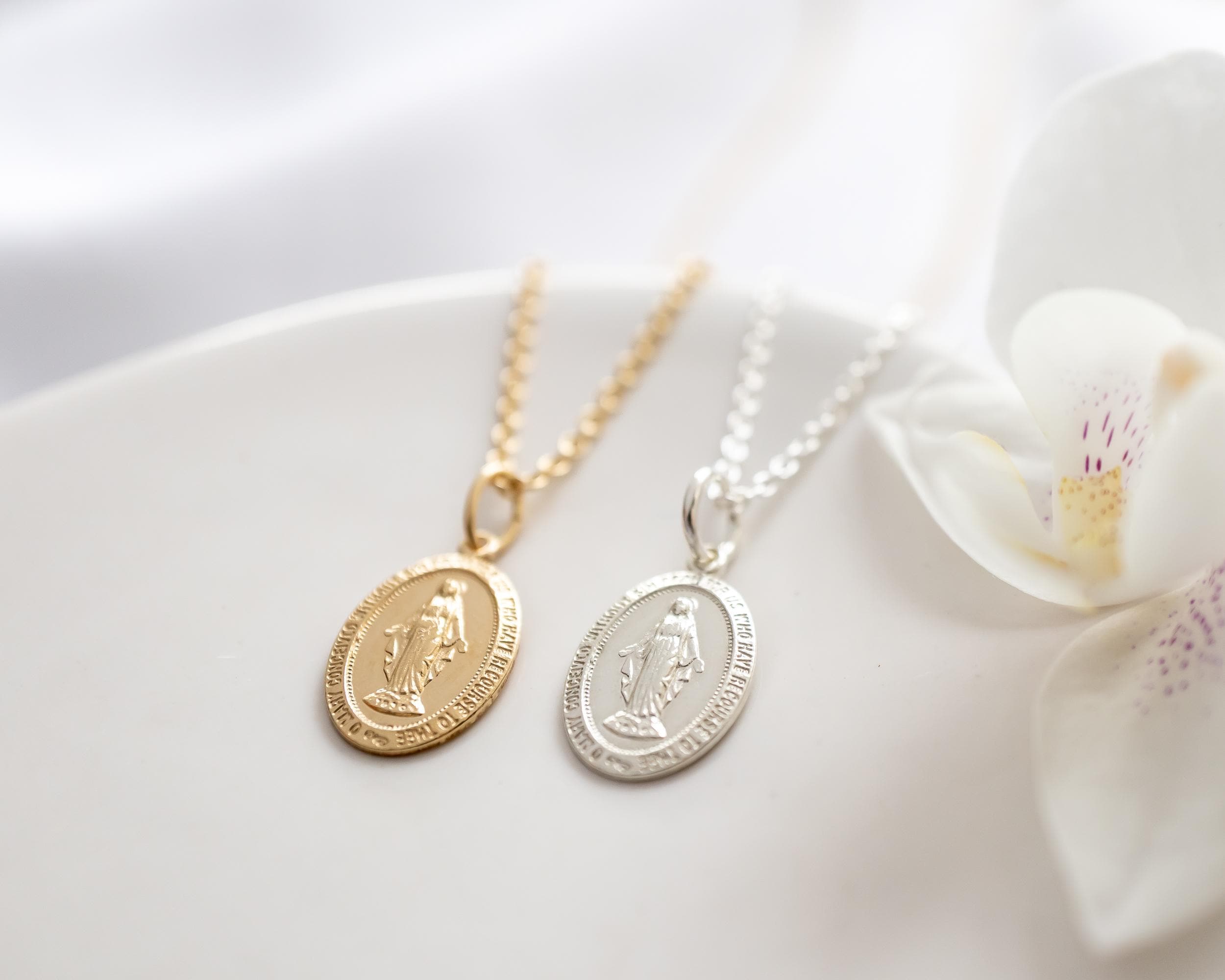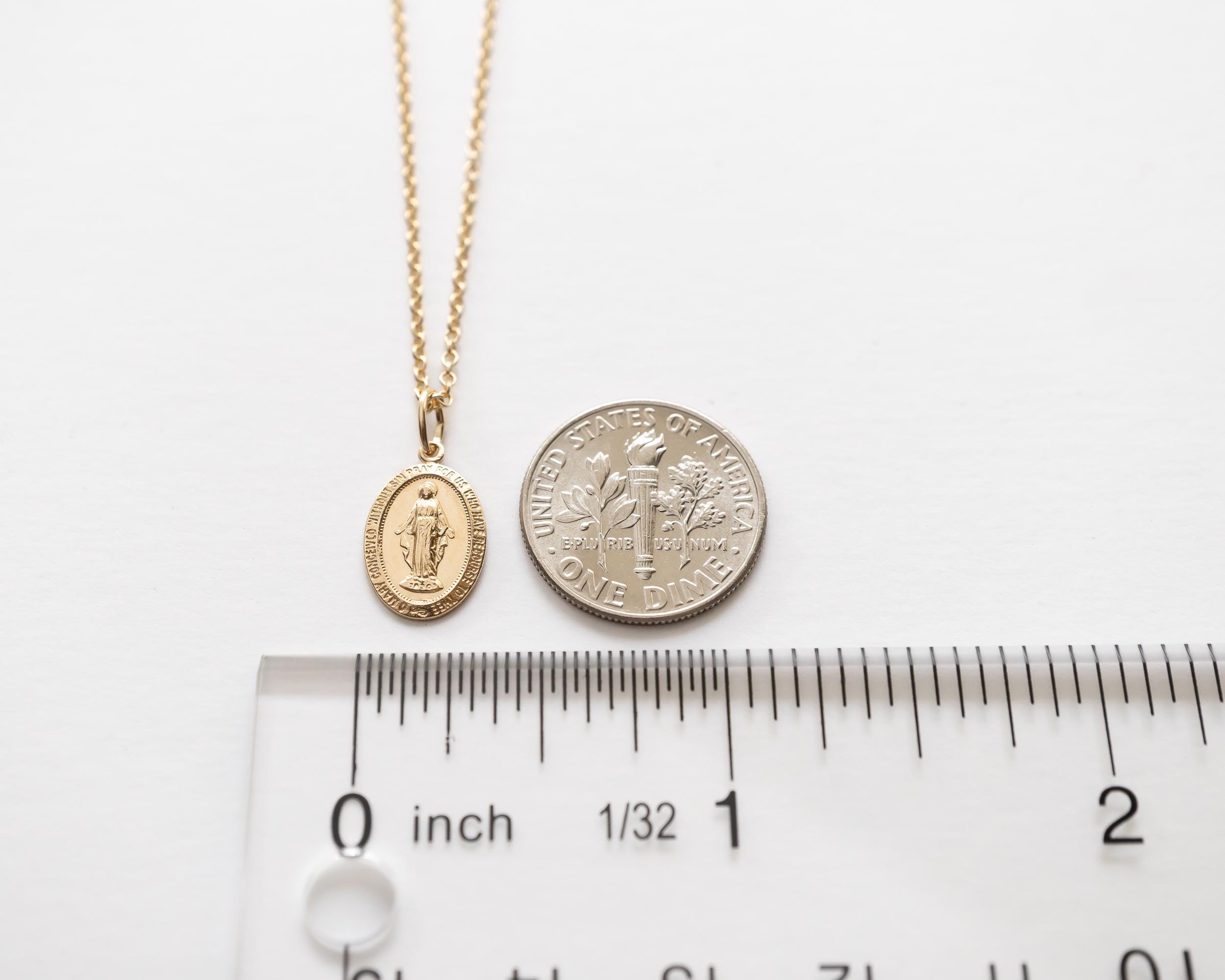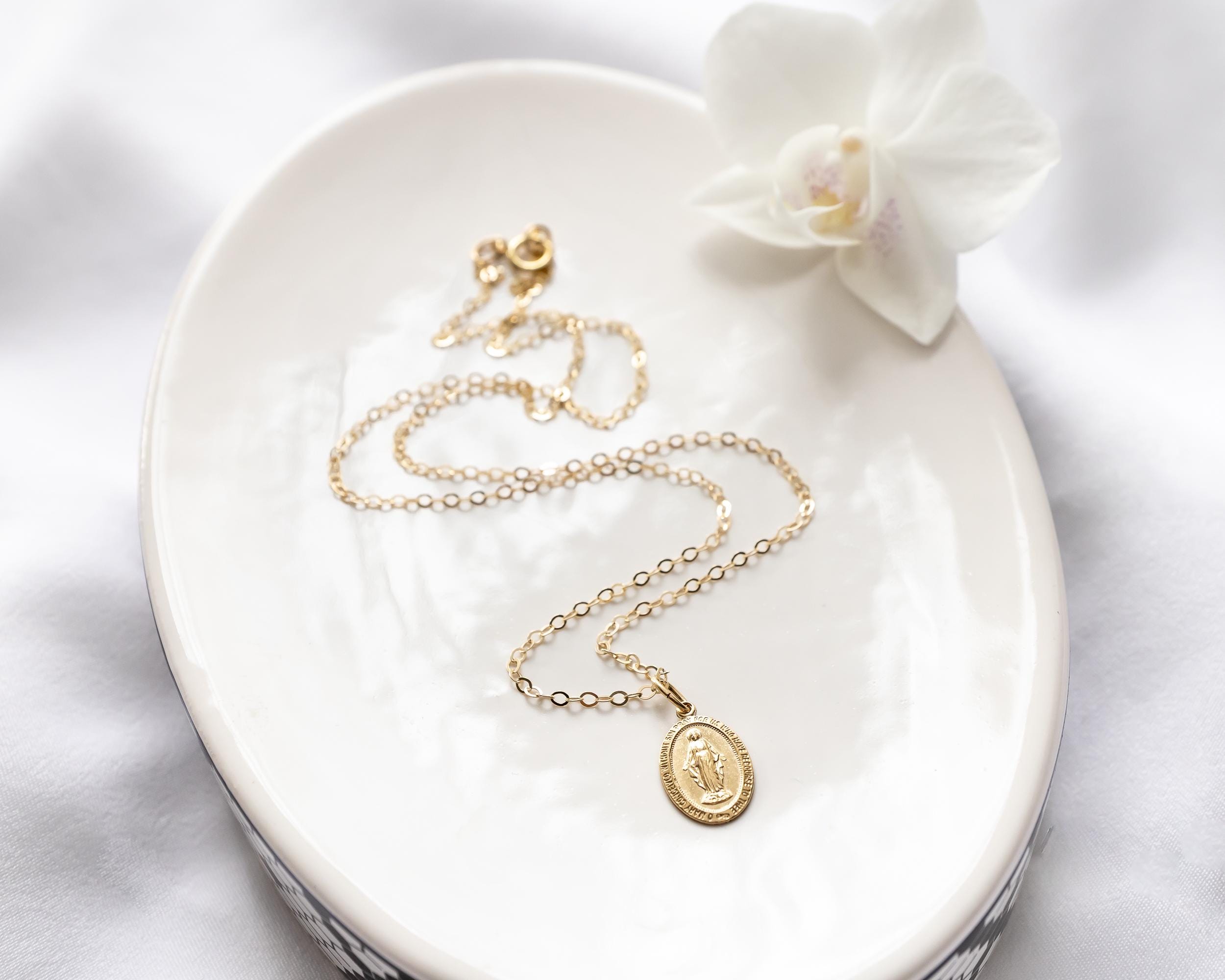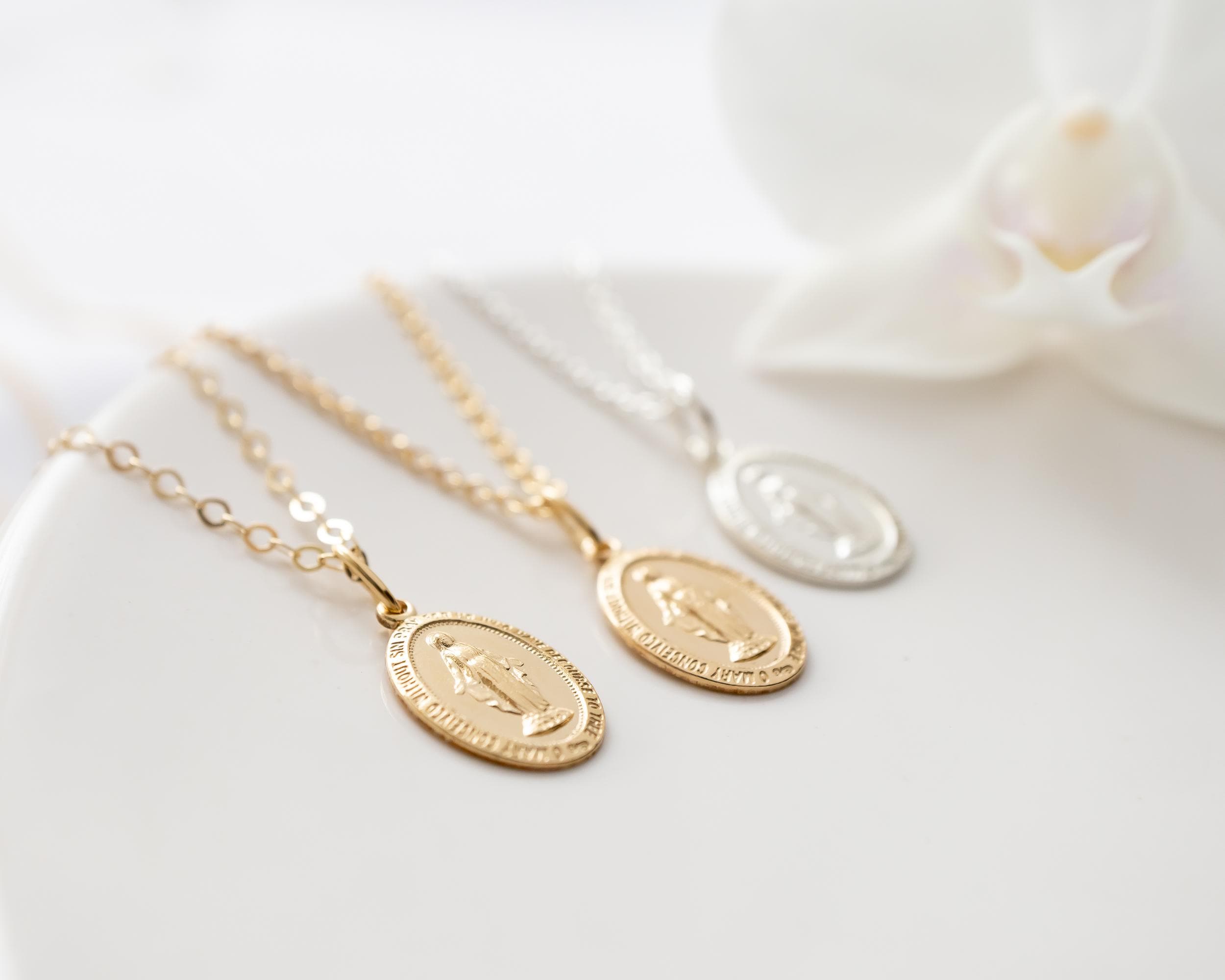 Intricate and iconic Miraculous Medal necklace for girls and women.