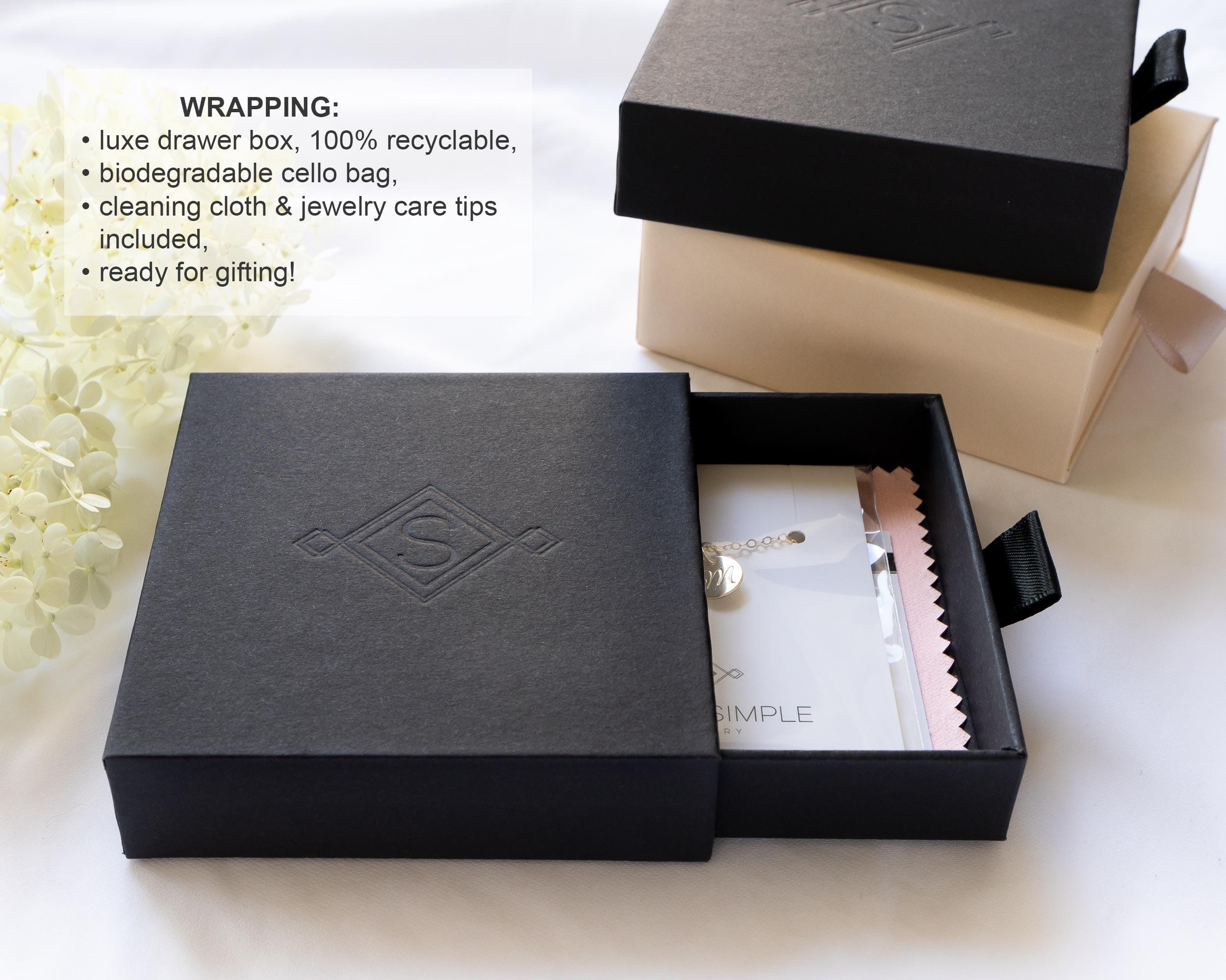 Your jewelry will arrive in our luxe, drawer-style jewelry box, made from recyclable paper and cardboard, ready for gifting.